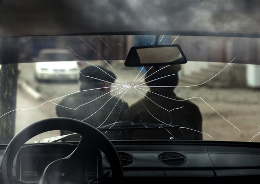 Men Sitting On The Hood Of A Car With A Broken Windscreen, Kochkor, Kyrgyzstan