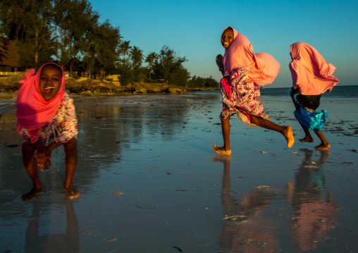Tanzania, Zanzibar, Kizimkazi, young muslim girls in school uniform on beach
